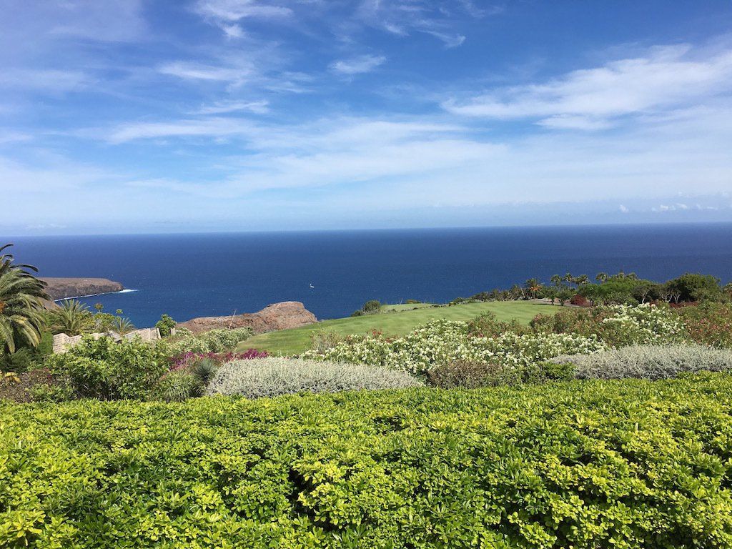 - Hotel Jardin Tecina perches on a high cliff above the small town of Playa de Santiago, charmingly traditional in style, the reception, bars, restaurants and pools are at the highest point of the resort with rooms then arranged on terraces to ensure every room has a view, either of the beautiful gardens or the Atlantic below. Our room (superior sea view) was decorated in a modest traditional style with a comfortable king size bed, and functional rather than luxurious bathroom, the highlight was the balcony overlooking the sea and it is definitely worth paying that little extra to get that view. The lateral rather than vertical arrangement of accommodation and facilities does mean there is a fair degree of walking to reach the restaurants, bars and the beach area but the advantage for golfers is the proximity of the golf club, probably only a 6 minute walk through banana groves. A quirky lift carved within the rock takes you down to the beach area where giant beach pebbles and the imposing black cliff rising above, give a Jurassic feel. The Beach Club Laurel pool and bar is a relaxing place for spending the afternoon after a morning of golf and a cocktail until the sun disappears behind the cliffs. You can move easily from the bar to the Trattoria Club Laurel for pizza cooked in a wood-fired oven, or a more formal dinner at El Laurel for meat and fresh fish cooked on a grill.